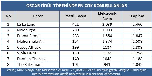 Moonlight, En İyi Uyarlama Senaryo, En İyi Yardımcı Erkek Oyuncu ve En İyi Film de dahil olmak üzere 3 dalda ödül kazanırken, yazılı basın ve internet medyasında toplam 2 bin 173 habere konu oldu ve La La Land’ın gerisinde kaldı.