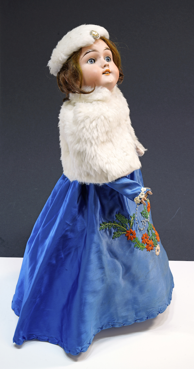 En şık bebek: Alman Max Handwerck üretimi 1889-1902 tarihli mavi elbiseli beyaz kürklü porselen bebek, yukarı kaldırdığı başıyla eski Alman asilzadelerinin mağrur duruşunu ve sentetik kürk şapkası ile de şıklığını günümüze taşıyor.