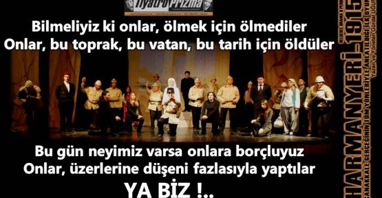 Tarihe sığmayan bu koca destanı, bilinmeyen tüm yönleriyle başarılı bir şekilde sahneye taşıyarak, bugüne kadar yapılmayanı yapan Tiyatro Prizma, önemli bir eksikliği gidermenin ve bir ilki başarmanın haklı gururunu yaşamaktadır. Çalışmalarını, prensip ve idealleri uğruna, bağımsızlığından ödün vermeden, tamamen kendi birikim ve imkanları ile yürüten grubun en büyük sorunu ise böylesine önemli ve ciddi bir projeyi yeterince kamuoyuna yansıtamamaları olarak belirtilmekte. Çanakkale konusunda ilgili gözüken birçok etkili ve yetkili, kişi ve kuruluşun, kendilerini hala görmezden gelmelerinden büyük üzüntü duyan grup üyeleri, tüm zorluklara ve olumsuzluklara rağmen,1915 yılının bilinmeyen yönlerini belgeleriyle sahneye taşımaya devam ederek, tüm gerçekleri gözler önüne serme kararlığını,yılmadan sürdüreceklerini ifade etmektedir...