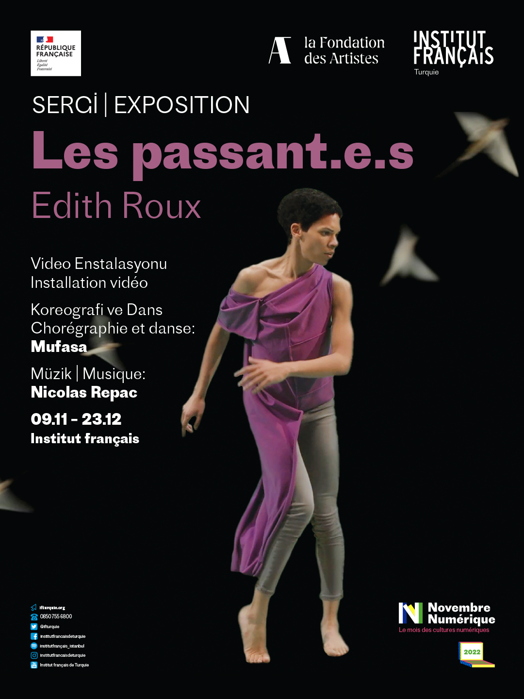 Dijital Kasım etkinlikleri kapsamında, Institut français Fransız sanatçı Edith Roux’nun “Les passant.e.s” adlı sergisine ev sahipliği yapıyor. Fransız Sanatçılar Vakfı ve Institut français İstanbul tarafından desteklenen eser 3 ekranlı bir video yerleştirmesidir. Sanatçı bu çalışmasında koreografi için Mufasa, müzik için ise Nicolas Repac ile çalışmıştır. Serginin adı “Les passant.e.s” türkçede “yoldan geçenler” anlamına geliyor. Sanatçı sergi başlığında kullandığı ifadeyle hem insanların ölümlü oluşundan hem de bir yoldan, bir şehirden geçen, kısa süreli tanışmalar yaşayan insanlardan bahsediyor. Sergi Institut français Istanbul sergi salonunda 23 Aralık’a kadar ziyarete açık olacak.