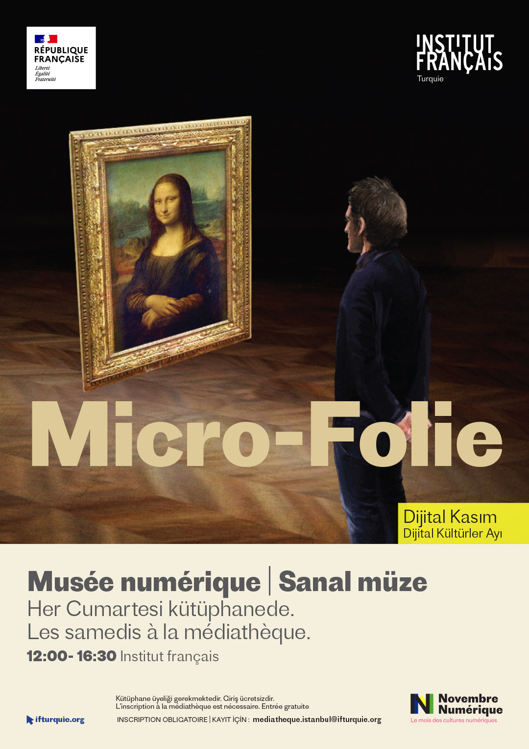 Tasarım, fotoğraf, plastik sanatlar, müzik, tiyatro, bilim, edebiyat, yeni teknolojiler alanında her tür üretimi teşvik eden Micro-Folie sanal müzesi Fransa’daki 8 önemli kurumda yer alan 250 başyapıtı dev ekranda ve tabletlerde yüksek çözünürlükte görme ve inceleme olanağı sağlıyor ve sanata erişimi kolaylaştırıyor. Proje dahilinde, Versailles Sarayı, Pompidou Merkezi, Louvre Müzesi, Picasso Müzesi, Quai Branly Müzesi, Philarmonie, Universcience ve diğer ulusal müzeler ile, Grand Palais gibi kurumlarda yer alan ve antik çağlardan günümüze dek uzanan dönemi yansıtan 250 sanat eseri, rehber eşliğinde izlenebilecek. Okul ve grup ziyaretleri için: 0312 408 82 33