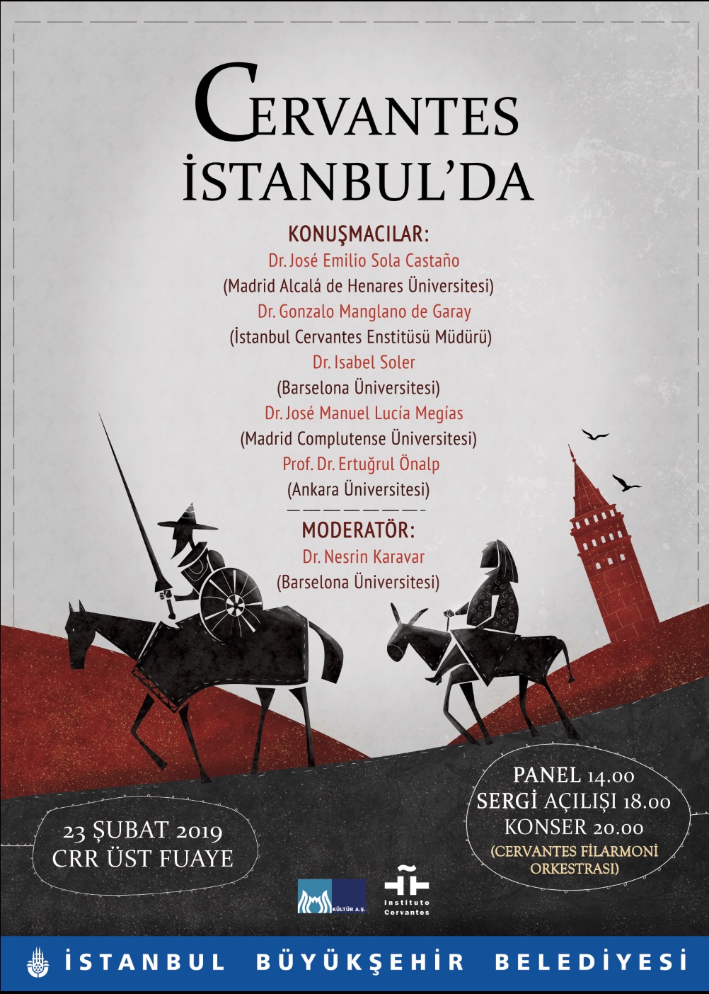 Cervantes etkinliğinin ikinci günü CRR Konser Salonu üst fuayesinde düzenlenecek olan, Türkiye ve İspanya’dan edebiyatçı, yazar ve akademisyenlerin katılacağı panelle başlayacak. Panel saat 14.00’te İBB Kültür Daire Başkanı Rıdvan Duran, İBB Kültür A.Ş. Genel Müdürü Kemal Kaptaner ve İstanbul Cervantes Enstitüsü Müdürü Dr. Gonzalo Manglano de Garay’ın yapacağı açılış konuşmalarıyla başlayacak.