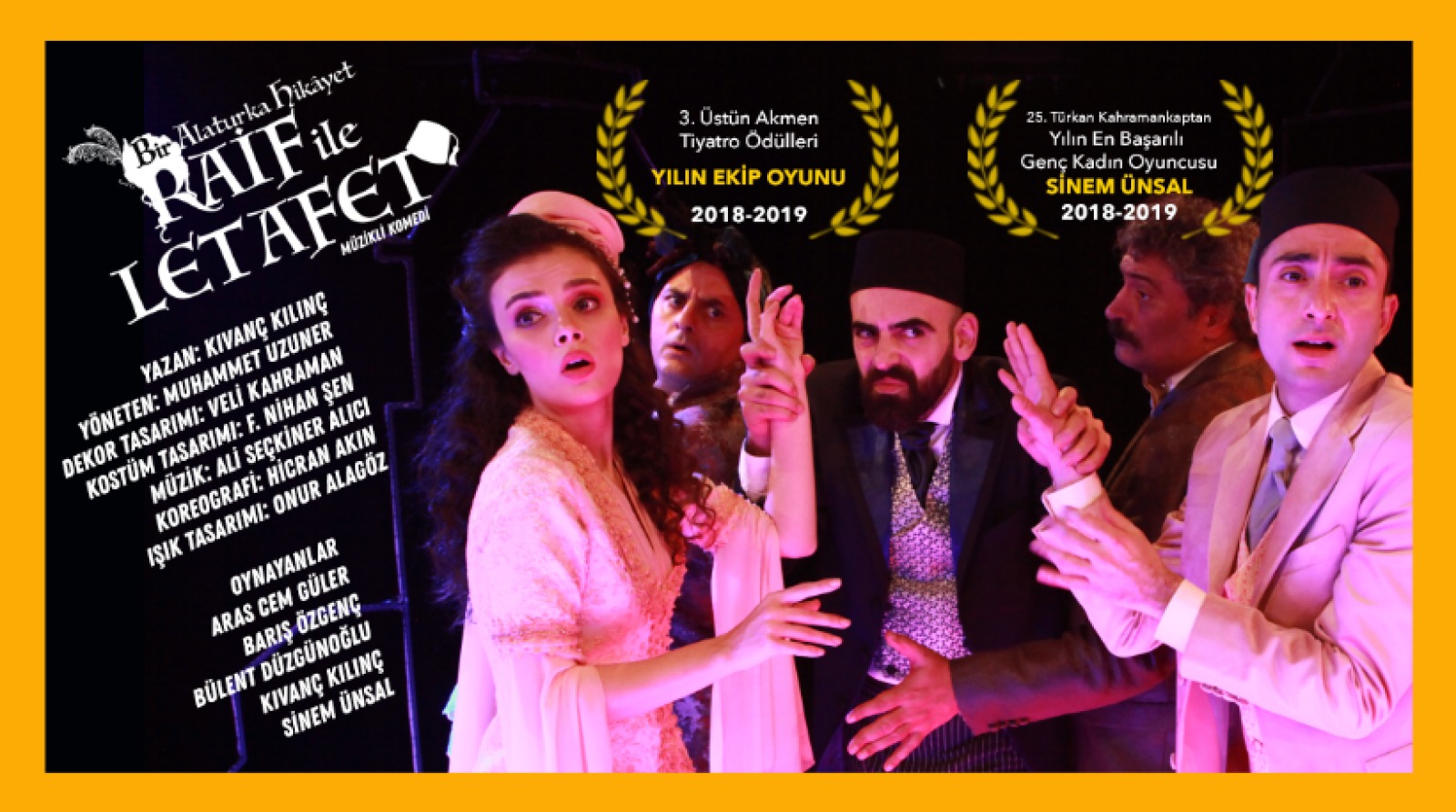 Kıvanç Kılınç'ın yazdığı, Muhammet Uzuner'in yönettiği, dekor tasarımını Veli Kahraman, kostüm tasarımını F. Nihan Şen, koreografisini Hicran Akın, müziklerini Ali Seçkiner Alıcı ve ışık tasarımını Onur Alagöz'ün yaptığı "RAİF İLE LETAFET" oyununda; Aras Cem Güler, Barış Özgenç, Bülent Düzgünoğlu, Kıvanç Kılınç ve Sinem Ünsal rol alıyorlar.
