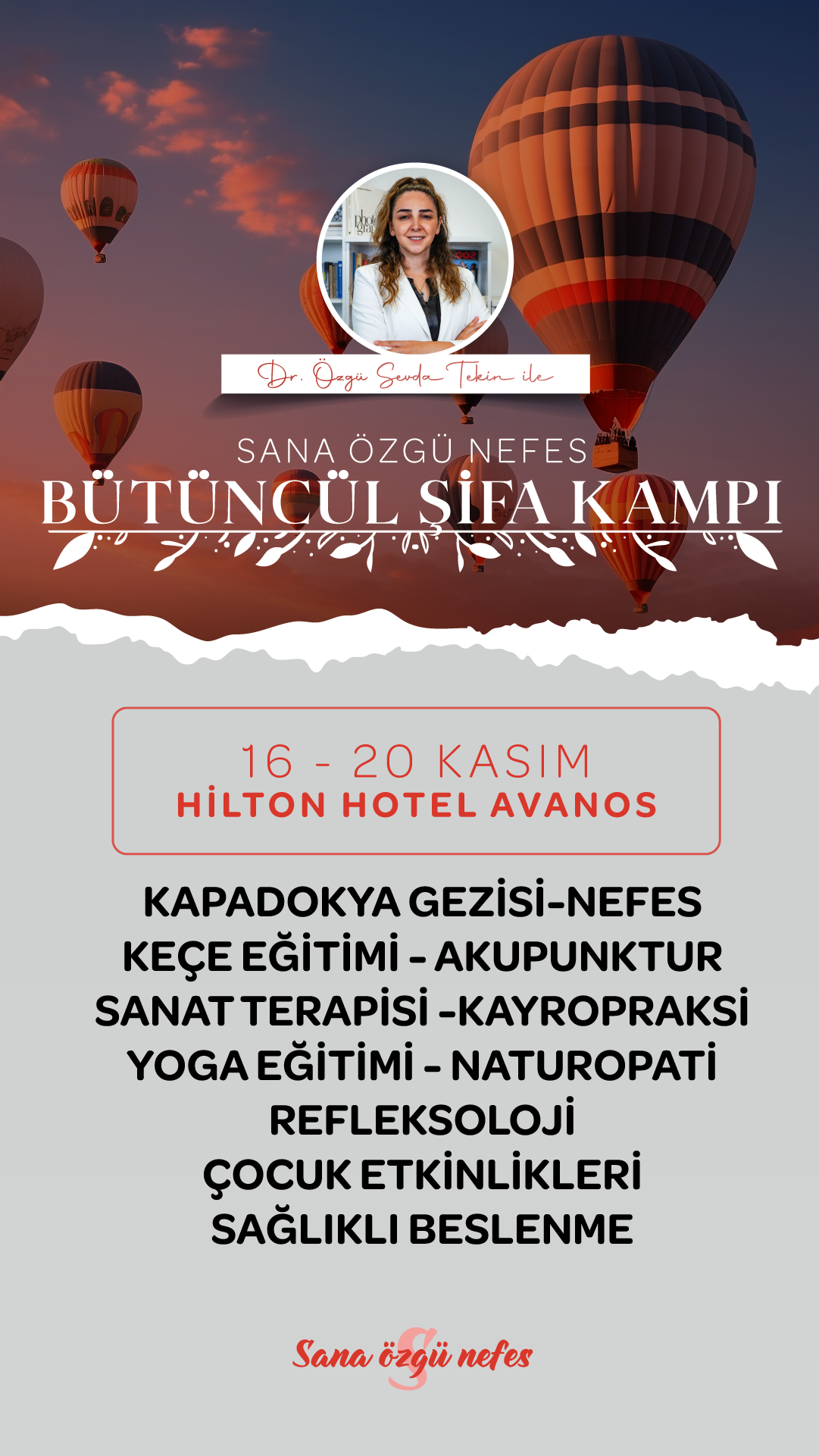 Dr. Özgü Sevda Tekin, kampla ilgili yaptığı açıklamada; Kapadokya’da ilk kez düzenlenecek şifa kampı etkinliklerinin bütününe bakıldığında, danışanların nefes terapisi sayesinde iç huzuru ve enerji dengelerini keşfedeceklerini ve diğer eğitmenler eşliğinde birçok farklı deneyimler yaşayacaklarının altını çizdi.